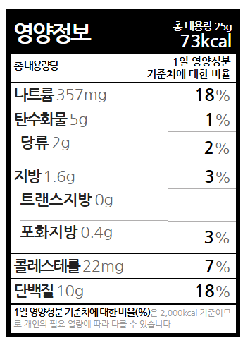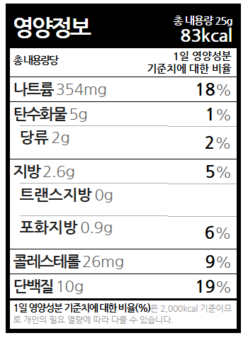 | 원재료명 및 함량 | 쇠고기87.4%(호주산), 솔비톨, 설탕, 비프시즈닝, 저키시즈닝, 후추, 아질산나트륨(발색제), 에르소르빈산나트륨(보존료), 고추맛기름[고추씨(국내산), 옥베유(외국산)] 소금 / 돼지고기87.7%(국내산), 솔비톨, 백설탕, 비프시즈닝, 저키시즈닝, 에르소르빈산나트륨(보존료), 아질산나트륨(발색제), 고추가루(국내산), 고추씨기름(중국산), 마늘가루(마늘가루,옥수수전분), 간장(대두,밀), 소금, 생강가루(생강가루,알파옥분), 후추, 양파가루(양파가루,알파옥분) / 고기89%(국내산/한우), 솔비톨, 설탕, 비프시즈닝, 저키시즈닝, 에르소르빈산나트륨(보존료), 아질산나트륨(발색제), 녹차액(국내산), 고추맛기름[고추씨(국내산),옥베유(외국산)] 소금, 후추 |